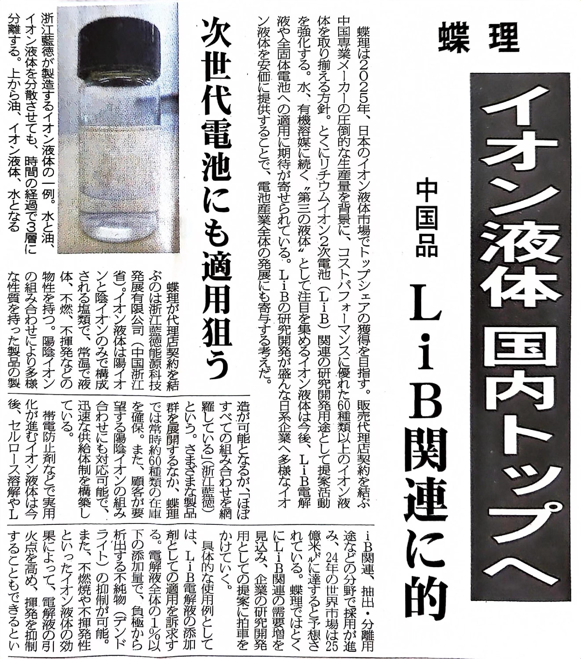 U japanskoj kemijskoj industriji Daily 10. srpnja 2023. godine relevantni sadržaj Zhejiang LDET Energy Technology Development Co., Ltd. (u daljnjem tekstu "LDET tehnologija") privukao je široku pažnju. Ovo izvješće pod nazivom "Primjena ionske tekućine u novim elektrolititima energetske baterije" detaljno opisuje važne rezultate istraživanja LDET tehnologije u području nove energetske tehnologije.