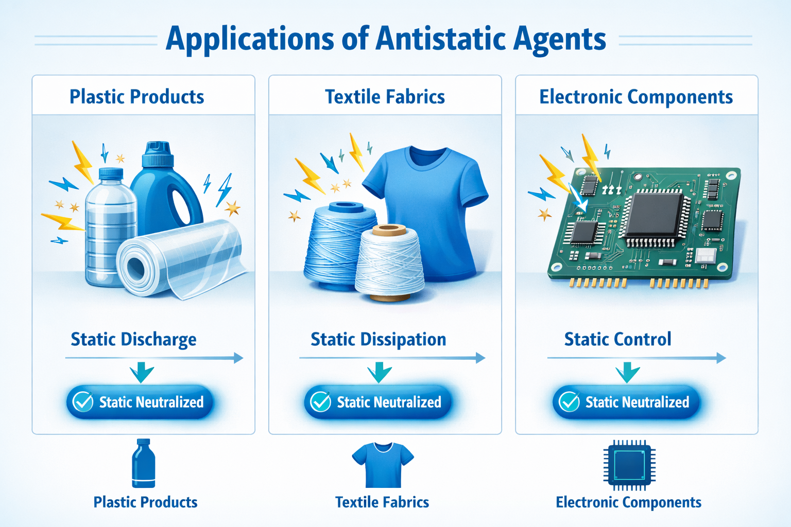 Elektronički uređaji i komponente vrlo su osjetljivi na elektrostatičko pražnjenje (ESD), koje može uzrokovati trenutnu štetu ili latentne kvarove. Antistatička sredstva koja se koriste u elektroničkim aplikacijama obično su integrirana u materijale za pakiranje, zaštitne filmove ili premaze za kontrolu nakupljanja površinskog naboja. Kriteriji odabira uključuju dugotrajnu stabilnost, nekorozivno ponašanje i kompatibilnost s osjetljivim komponentama.
